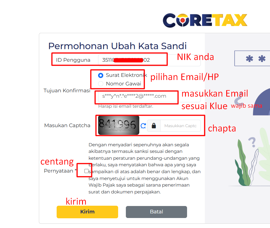5. Perhatikan Klue yang muncul pastikan masukkan Surat Elektronik / Nomor Gawai yang sesuai