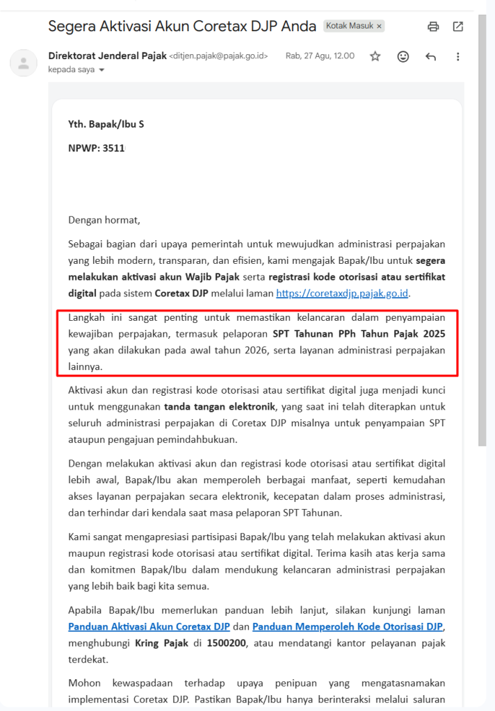 Langkah ini penting untuk memastikan kelancaran akses layanan perpajakan elektronik, termasuk pelaporan SPT Tahunan 2025, penggunaan tanda tangan elektronik, dan berbagai layanan administrasi lainnya.
